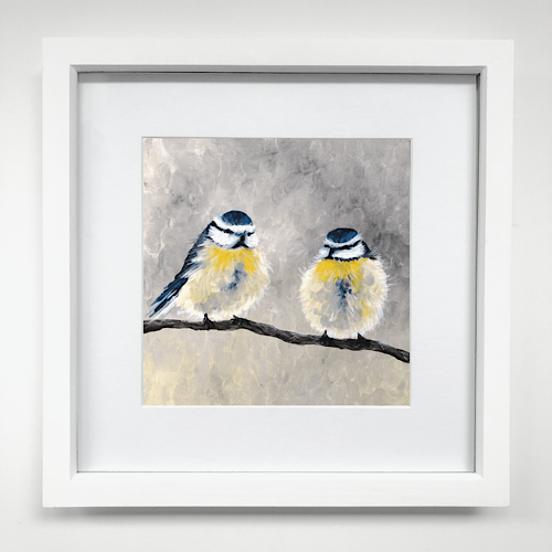 This beautiful fine art print is from my original painting of blue tits titled Never Far From Home.